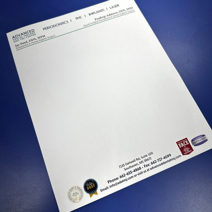 Letterhead is customized stationary that typically showcases a company or person. Our Letterhead is also available on linen texture stock for a unique look and feel. One common option is to order second sheets that typically only include the logo from your full Letterhead without address and other contact information. Use the Letterhead with the full details for the first page of correspondence. Logo-only second sheets are also great for internal communication. To get second sheets, place a separate order for Letterhead with just the logo graphic. Make sure to order the same stock and printing method.